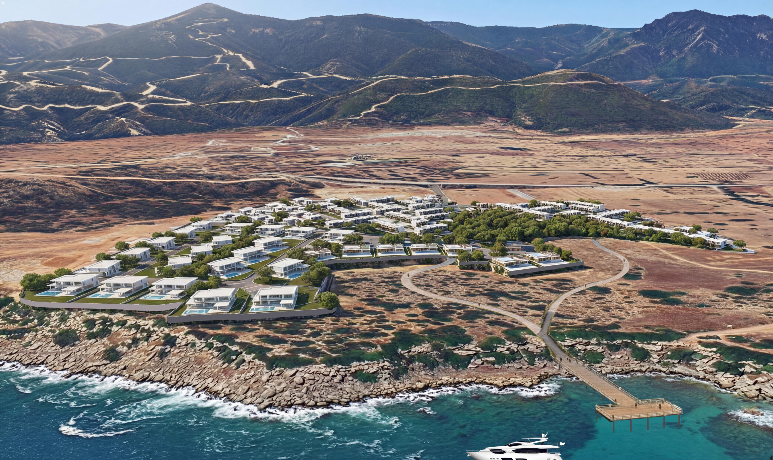 Diese zwei exklusiven Bungalow-Villen im Blue Zone Resort in Tatlısu gehören zu den seltensten Immobilienlagen in Nordzypern: erste Reihe direkt am Meer, mit freiem Blick auf die Küste und die Berge.